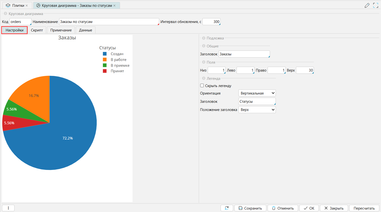 Данные на плитке представлены в виде круговой диаграммы, вид которой настраивается на вкладке Настройки. Слева отображается, как будет выглядеть плитка.