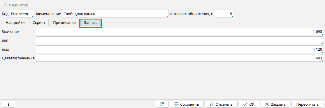 На вкладке Данные (рис. 15) для индикатора отображаются максимальное (max) , минимальное (min), текущее (Значение) и Целевое значение.