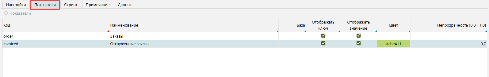 Код - уникальный идентификатор показателя, который используется в коде на вкладке **Скрипт **для вычисления значения показателя.