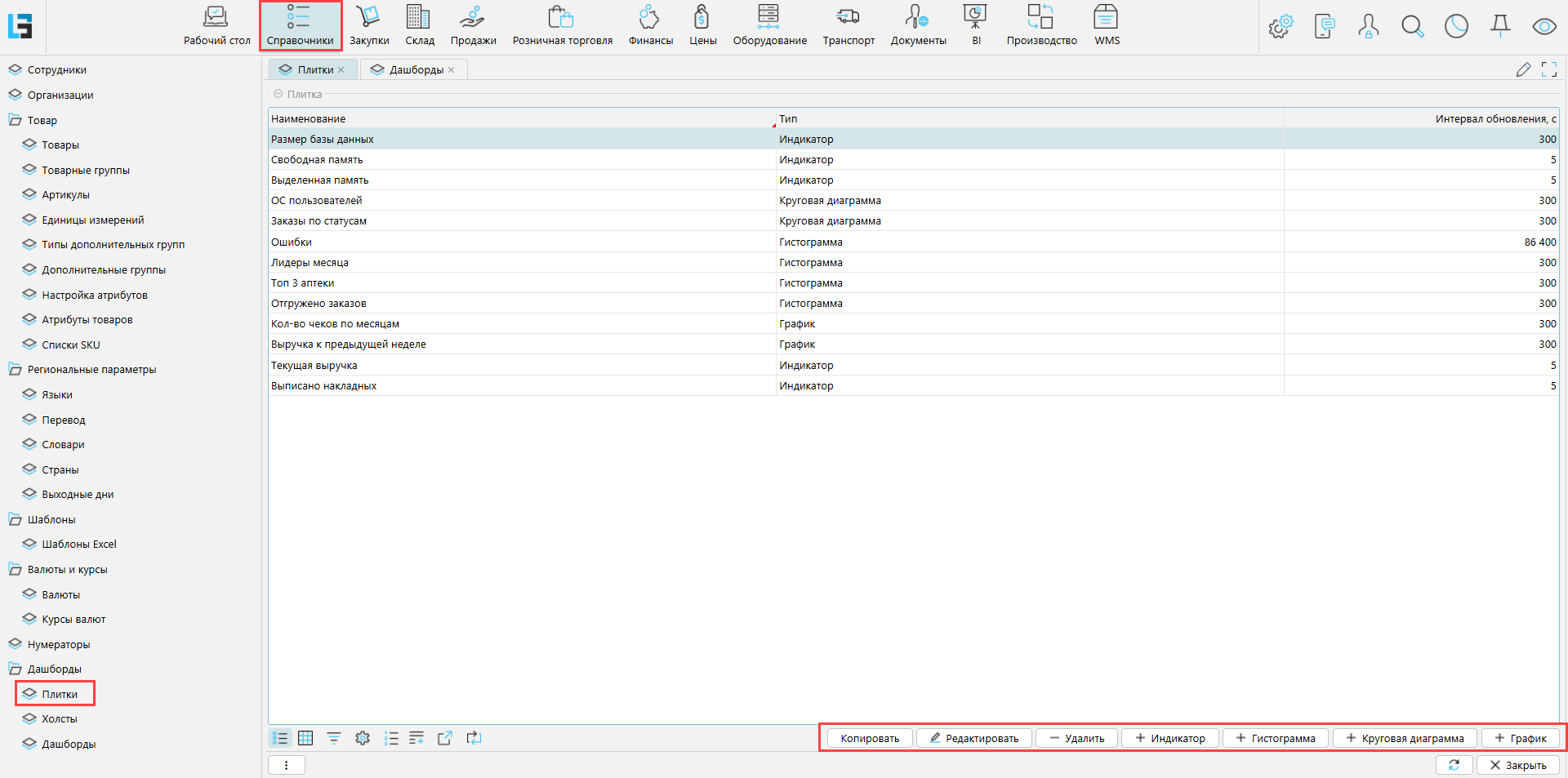 Список настроенных плиток отображается на форме Справочники - Дашборды - Плитки. Здесь же можно удалять, корректировать плитки, и создавать новые.