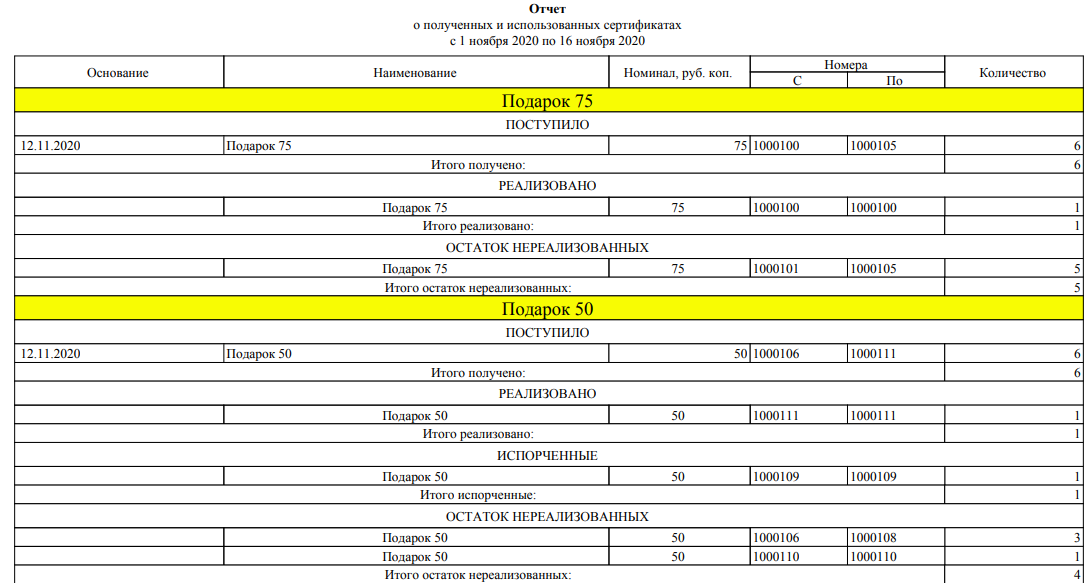 Отчеты по подарочным сертификатам