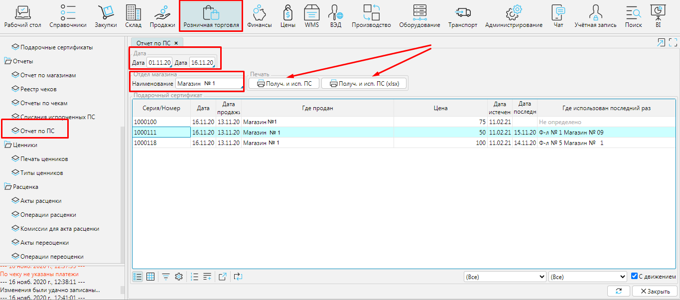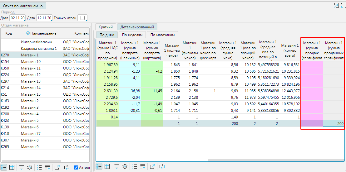 В  Розничная торговля - Отчет по магазинам доступны колонки с данными продаж по сертификатам.