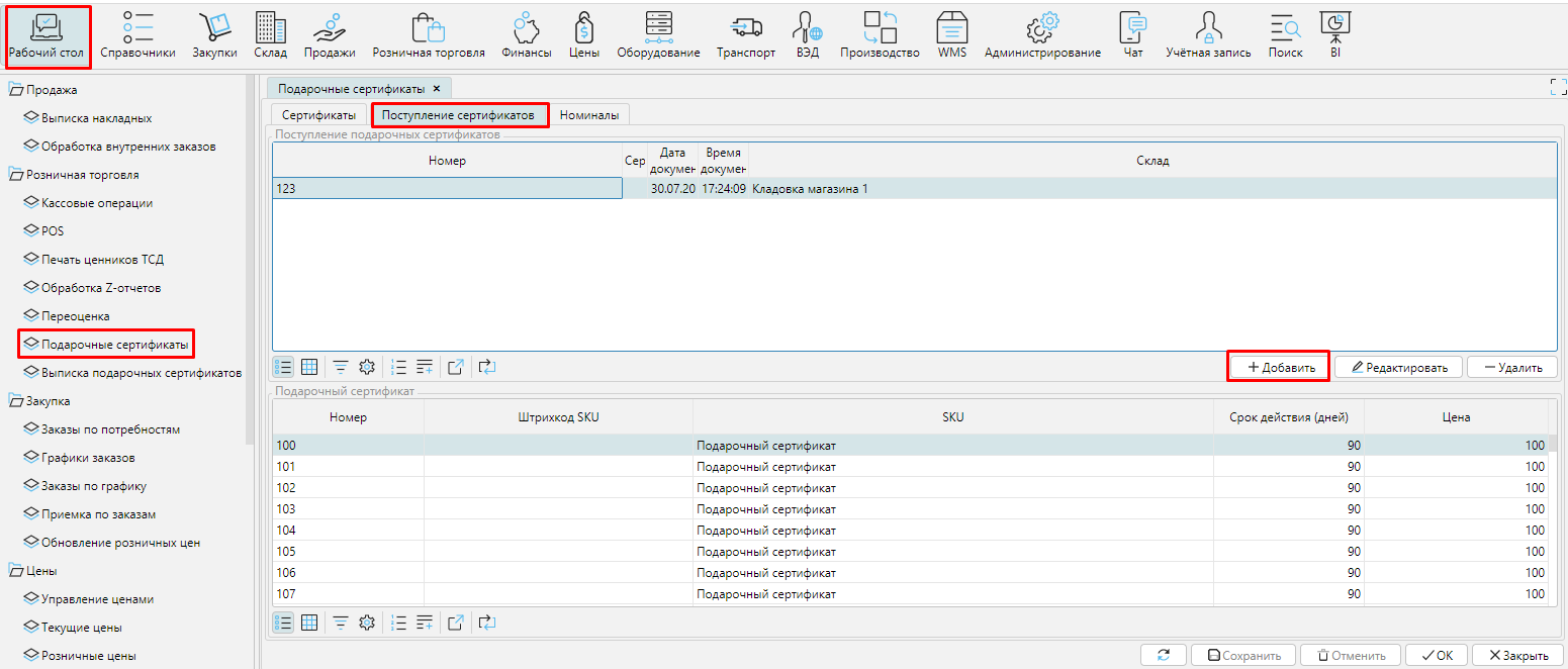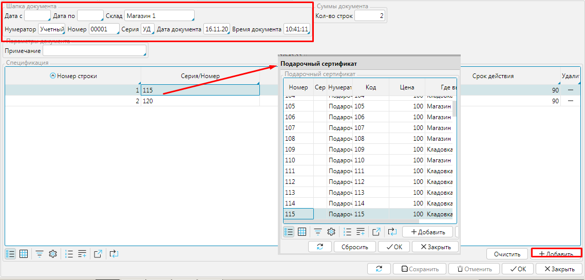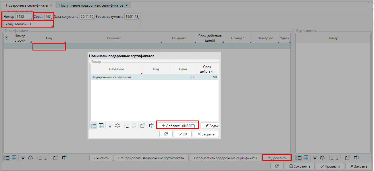 В шапке заполняем Номер, Серию, выбираем магазин (Склад) и нажимаем кнопку **Добавить. ** В спецификации появится пустая строка, в которой необходимо указать номинал сертификата. Для этого в строке нажимаем на поле Код (или Номинал) и выбираем номинал Подарочного Сертификата из доступных. Если нет нужного номинала, необходимо нажать кнопку Добавить и ввести все нужные параметры для нового номинала сертификата.