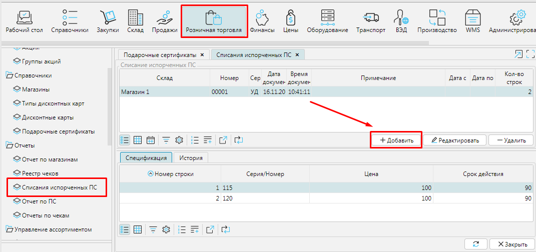 Списание испорченных производится на форме  Розничная торговля - **Списание испорченных ПС, **где отображаются документы списания и номера списанных сертификатов.  Чтобы списать ПС необходимо создать новый документ - кнопка Добавить.