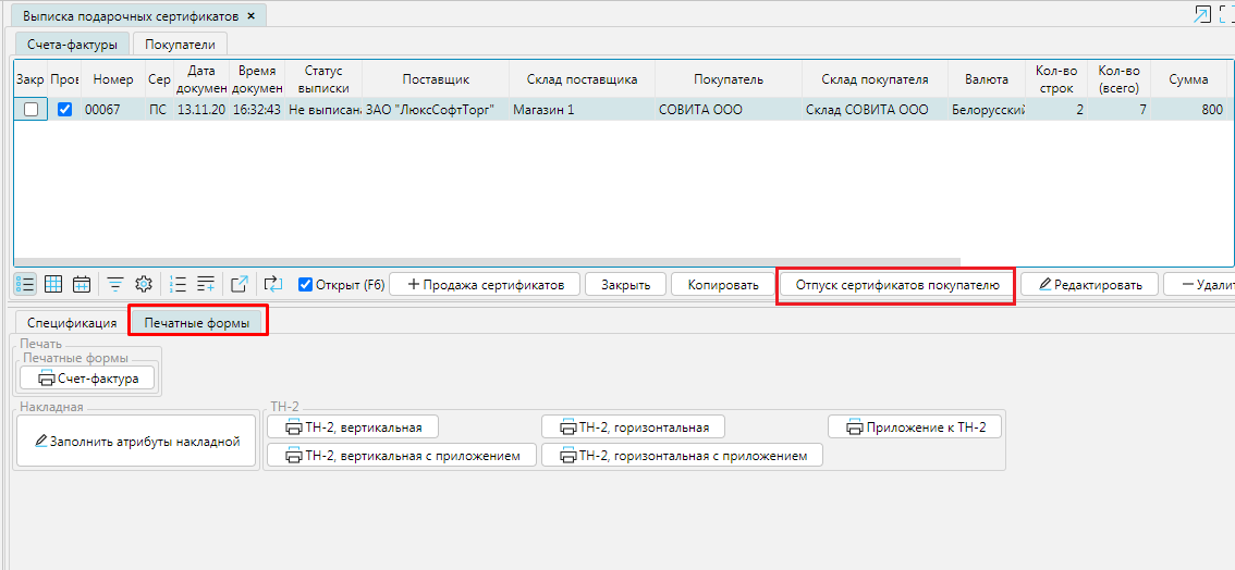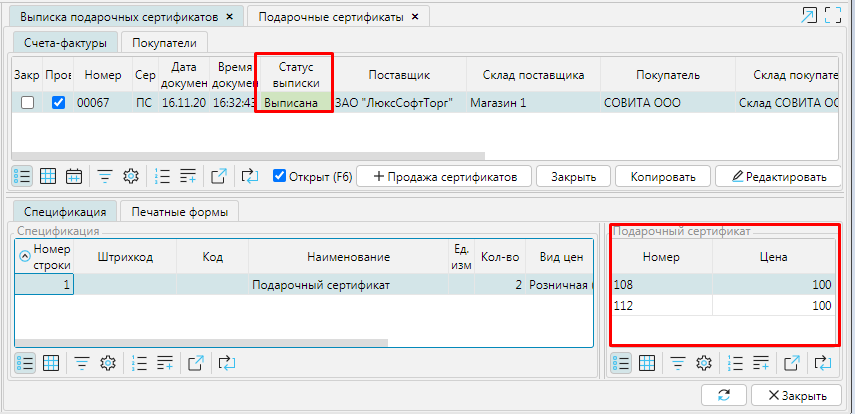 Статус выписки накладной изменится на Выписана, на форме Выписка подарочных сертификатов в блоке Подарочные сертификат отображаются номера проданных сертификатов. На форме Подарочные сертификаты вкладка **Сертификаты ** будет отображена информация о дате и месте продажи сертификатов. При использовании модуля POS lsFusion  данные сертификаты уже могут быть использованы для оплаты. При работе c другими системами, могут понадобится дополнительные действия для отправки информации о сертификатах на кассовые серверы.