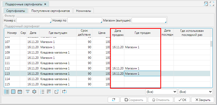 Сертификаты можно перемещать в другие магазины/склады, однако это не будет отражено как движение сертификата.