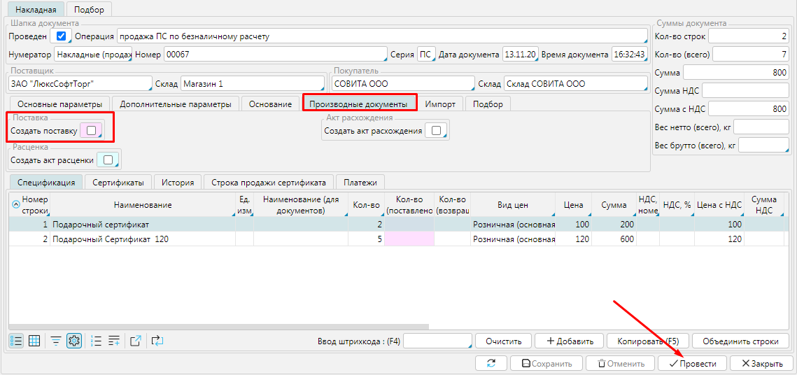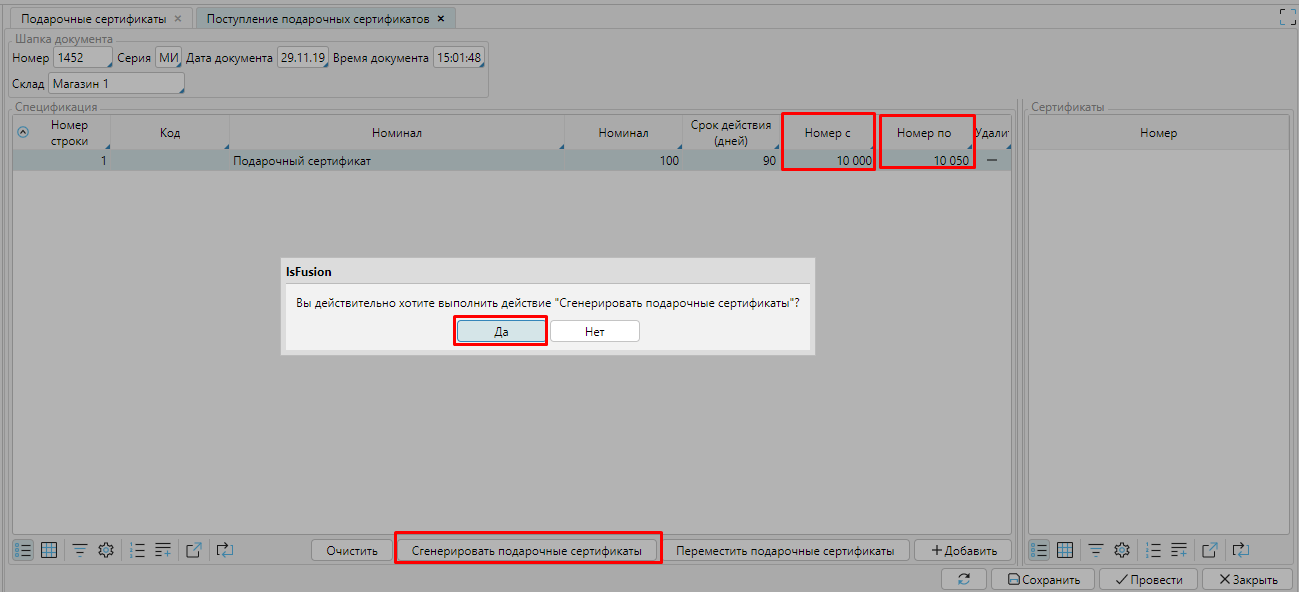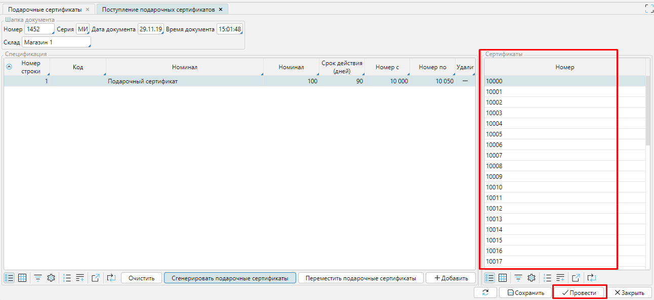 Будут созданы сертификаты, их номера будут сгенерированы в соответствии с настройками. Чтобы завершить процесс создания сертификатов необходимо Провести документ.
