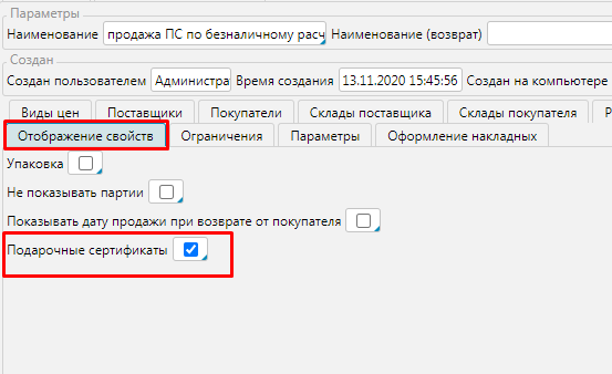 2. В настройках операции продажи ПС (Продажи - Справочники/Операции)на вкладке Отображение свойств отметить Подарочные сертификаты.