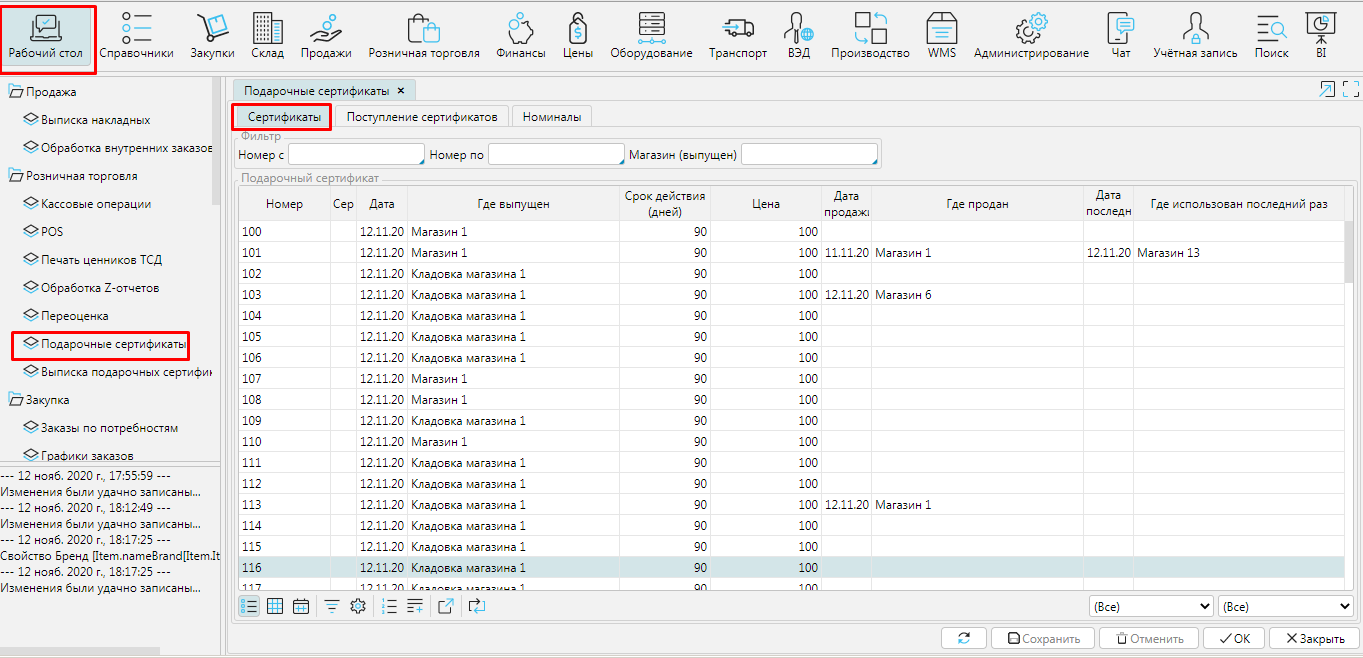 Основная работа с подарочными сертификатами осуществляется на форме Рабочий стол - Подарочные сертификаты. На вкладке Сертификаты отображаются все сертификаты, которые есть в системе и информация об их выпуске, продаже и использовании.