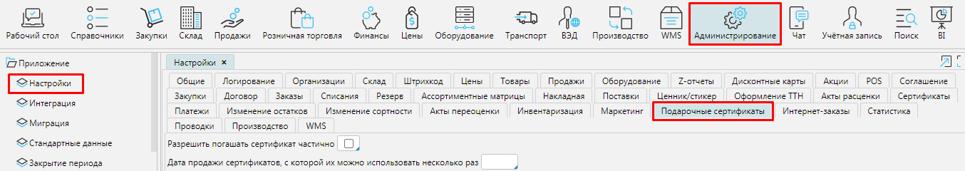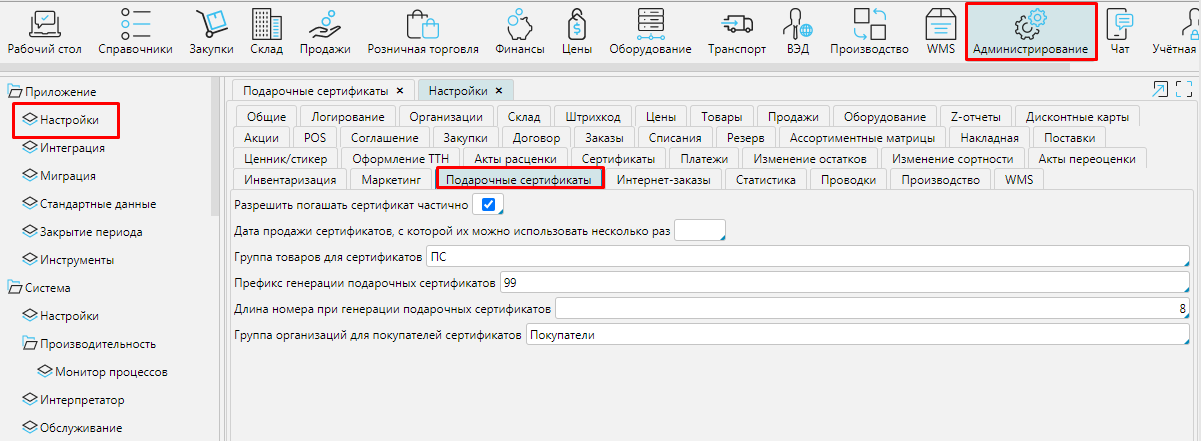 В Администрирование - Настройки на вкладке Подарочные сертификаты  вводятся первоначальные настройки: