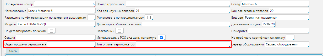 В группах касс необходимо настроить Отдел продажи сертификата и Тип оплаты сертификатом для корректного обмена данными с фискальным регистратором. Для касс VM и Sento данная настройка не нужна.