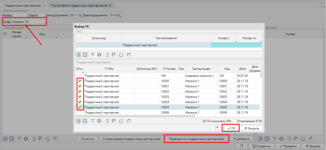 Выбрать склад, на который мы будем перемещать, нажать кнопку Переместить ПС, выбрать ПС, которые мы будем перемещать на этот склад, нажать **ОК **и после этого Провести документ.