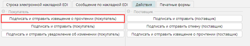 Все загруженные накладные отображаются на форме Финансы - Электронные накладные EDI. Получатель накладной должен подтвердить ее получение. В системе по умолчанию предусмотрена автоматическая отправка подтверждения получения документов. Если она отключена (см. рис.1), отправить подтверждение можно на форме Финансы - Электронные накладные EDI** **на вкладке Действия командой **Подписать и отправить извещение о прочтении (покупатель). **Также подтверждение о получении можно отправить уже после формирования накладной закупки на вкладке Печатные формы - Электронная накладная (рис. 7).