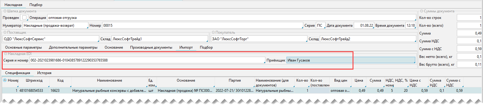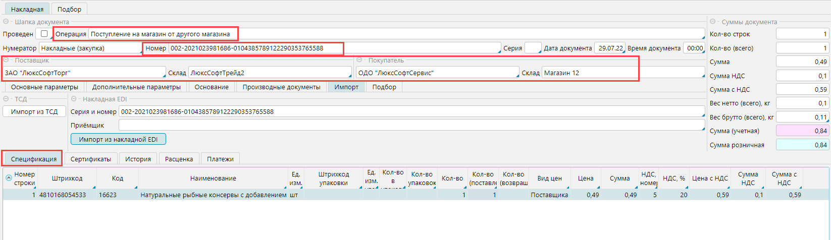 Рис. 5 Приходная накладная на основе электронной накладной от поставщика