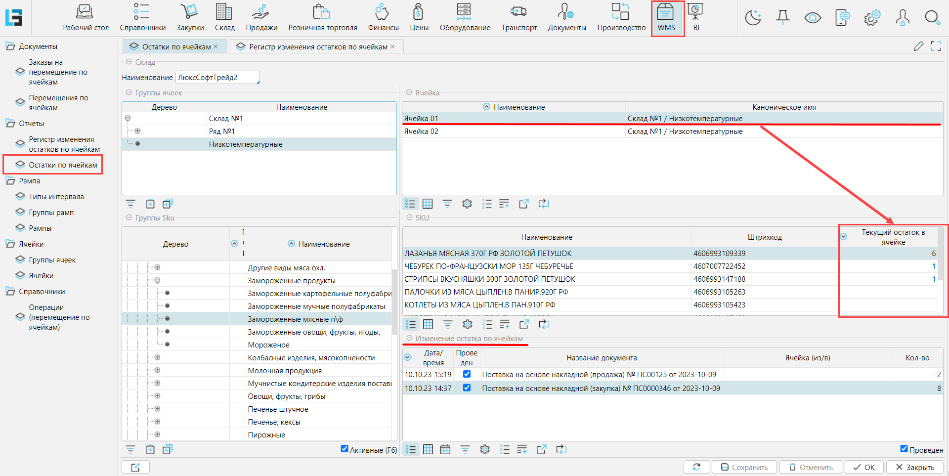 Выделите ячейку и в блоке SKU отобразится текущий остаток товаров в ячейке, а также документы движения выделенного товара по ячейке.