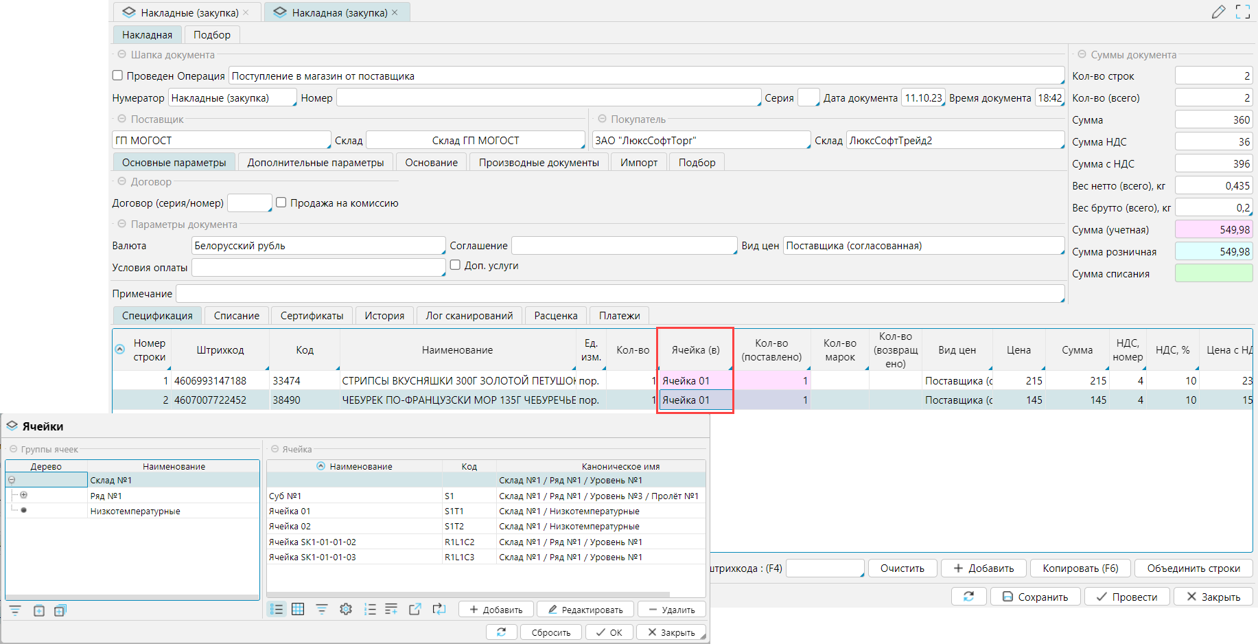 В приходной накладной накладной будет отображаться столбец Ячейка (в), в которой нужно указать ячейку, куда поступает товар.