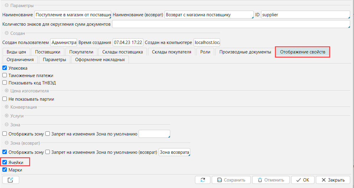 При получении или отгрузке товара в соответствующих документах можно указать в какую ячейку должен быть помещен товар или из какой ячейки отгружен. Для этого в настройке операции документов прихода и расхода на вкладке Отображение свойств должен быть отмечен признак Ячейки.