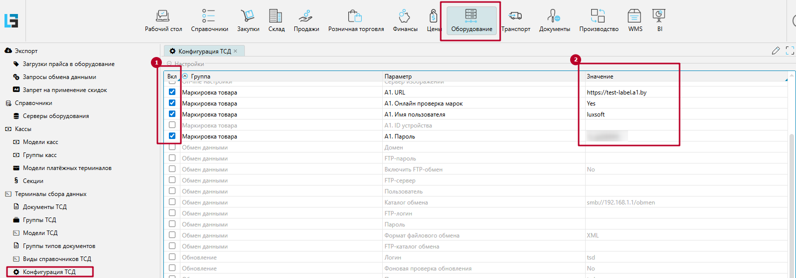 1. На форме Оборудование - Терминалы сбора данных - Конфигурация ТСД отметить признак Вкл. для Группы параметров Маркировка товаров