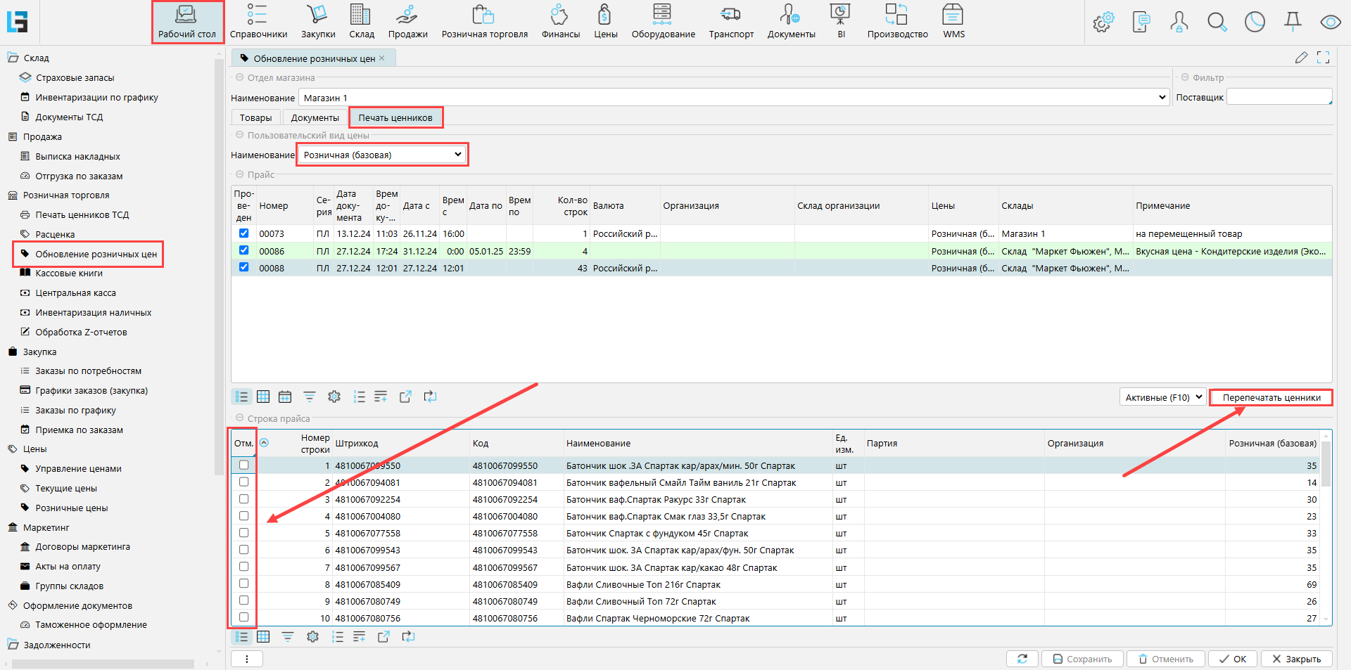 Работа на форме "Обновление розничных цен"