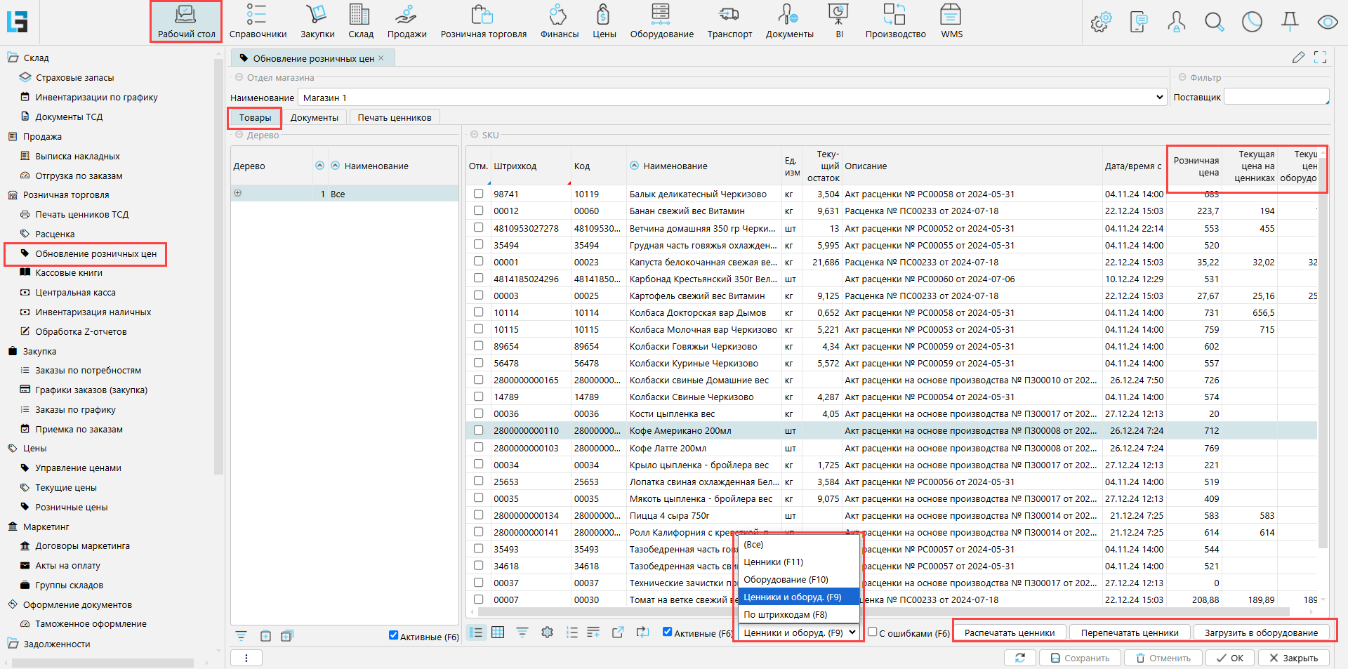 Для обновления цен, товары отмечаются (колонка «Отм.») и используются кнопки «Распечатать ценники», «Перепечатать ценники» и/или «Загрузка в оборудование». После успешного выполнения, товары исчезают из отбора на вкладке «Товары».