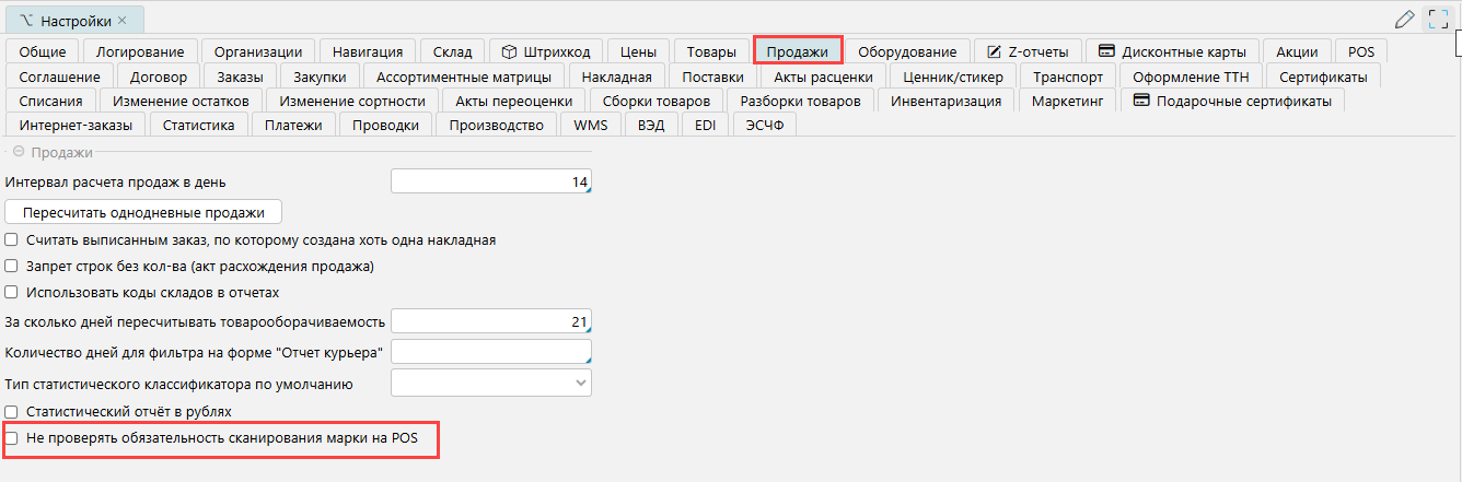Рис. 7 Отключение обязательного сканирования марки на POS