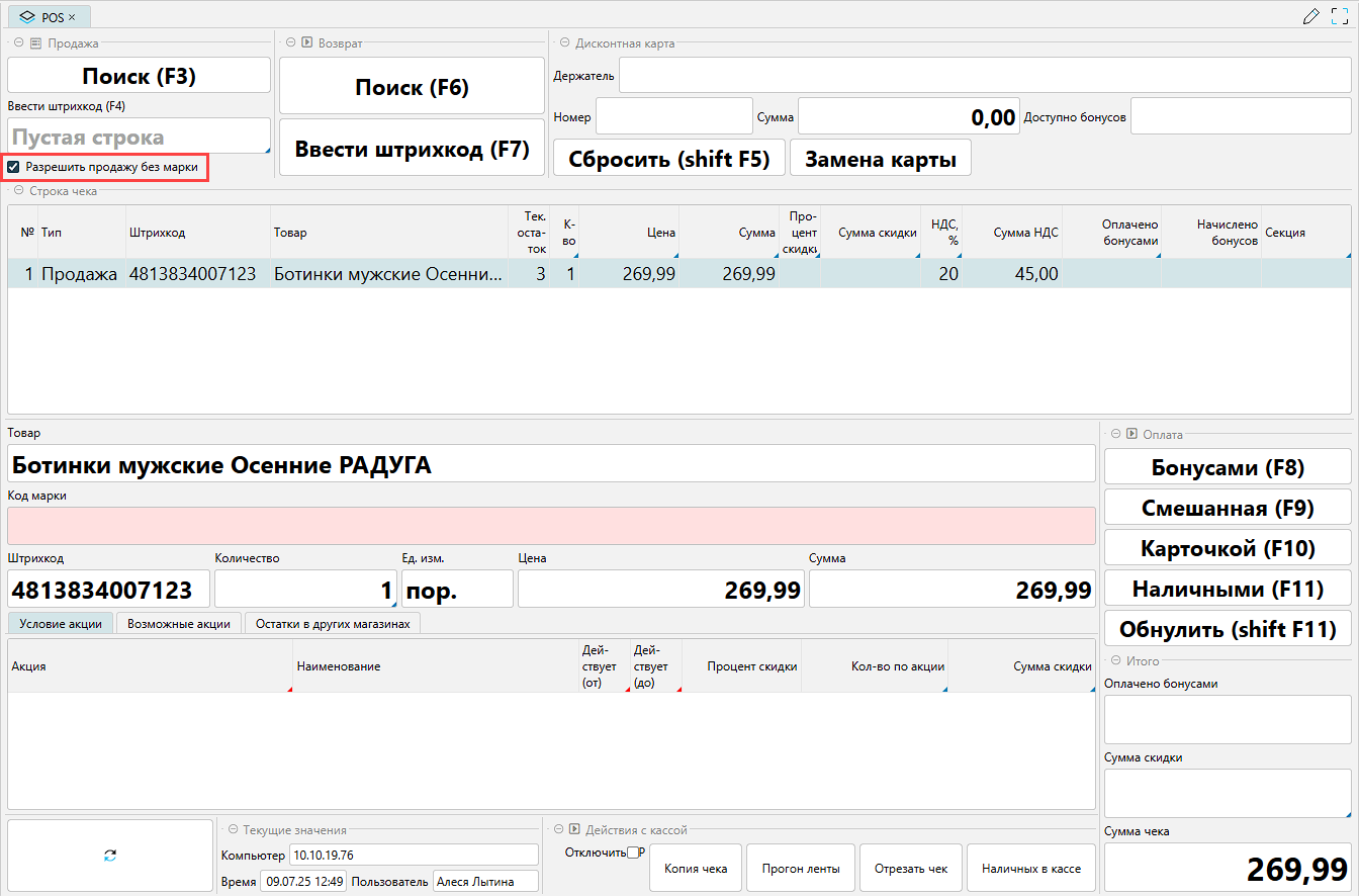 Признак Разрешить продажу без марки отображается только у кассиров с настроенным доступом.