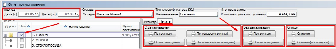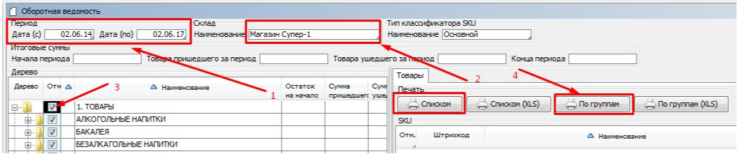 Выбираем Диапазон дат. Выбираем Склад. В дереве Классификатора отмечаем Группу товаров или все Товары.