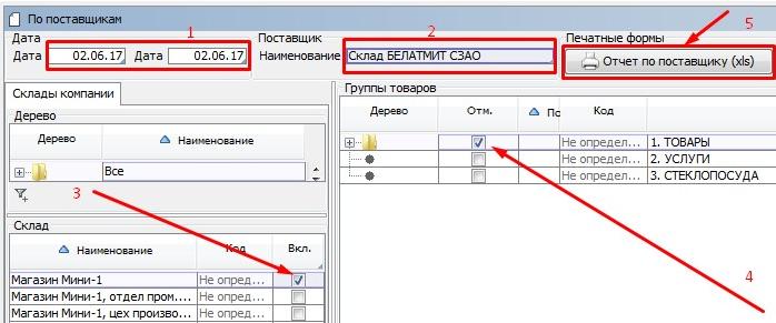 Заходим на форму «По поставщикам» модуль Склад раздел Отчеты.