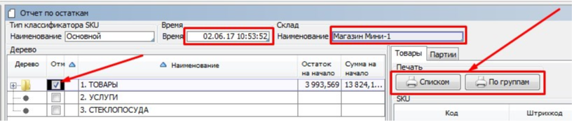 Выбираем Дату. Выбираем Склад. Отмечаем Группу товаров. Нажимаем кнопку «Списком» или «По группам».