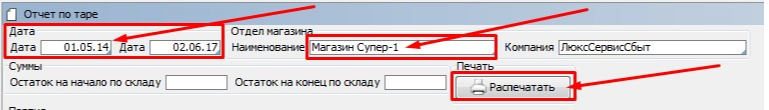 Заходим на форму «Отчет по таре»  модуль Склад раздел Отчеты.
