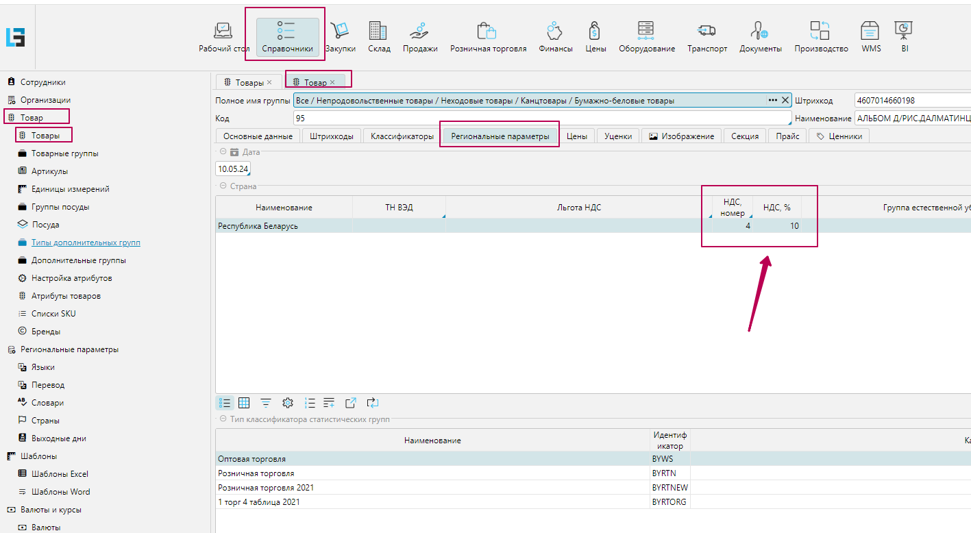 В остальных случаях для расчета сумм НДС применяются фиксированные ставки НДС из журнала Финансы/Налоги, добавленные в карточках товаров как "Региональные параметры":