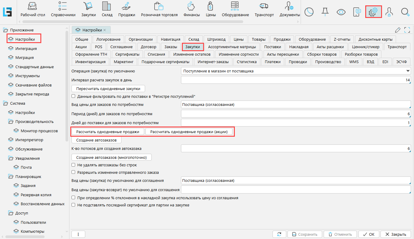 Так как показатель среднедневных продаж не меняется на протяжении текущей даты, для экономии ресурсов среднедневные продажи (как обычные, так и акционные) рассчитываются автоматически по заданию планировщика для каждой пары товар и склад, и далее система использует значение рассчитанных показателей. Задание планировщика обычно настраивается на время, когда система наименее нагружена, например, ночью. Если задание планировщика не настроено. то среднедневные продажи не рассчитываются. Разово рассчитать среднедневные продажи можно используя на форме Администрирование - Настройки на вкладке Закупки кнопки: