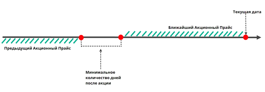 Для этого система находит ближайший акционный прайс (БАП ): это прайс, Дата с которого < текущей даты и предыдущий акционный прайс (ПАП) либо не существует, либо период между Дата по (ПАП) и Дата с (БАП) >= Минимальное количество дней после акции.