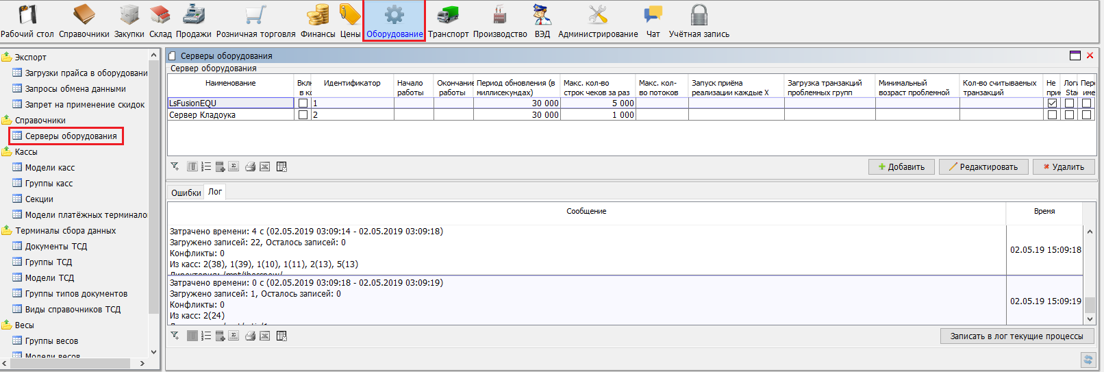 На вкладках «Ошибки» и «Лог» отображается информация, касающаяся только приема реализации из касс. По кнопке «Записать в лог текущие процессы» на вкладке «Лог» можно сохранить информацию о java-потоках сервера оборудования.