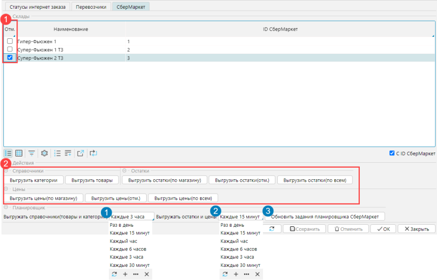На форме можно создать задание планировщика. Для этого в полях Выгружать справочники (товары и категории) и Выгружать остатки и цены нужно выбрать подходящий интервал выгрузки и нажать кнопку Создать задания планировщика СберМаркет. Будут созданы активные задания на выгрузку для всех магазинов.