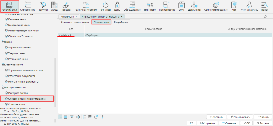 На форме Рабочий стол – Справочники интернет-магазина на вкладке Перевозчики необходимо создать перевозчика для сервиса «СберМаркет». Наименование перевозчика может быть любым, а код обязательно должен быть «sberMarket» (Рис. 3).