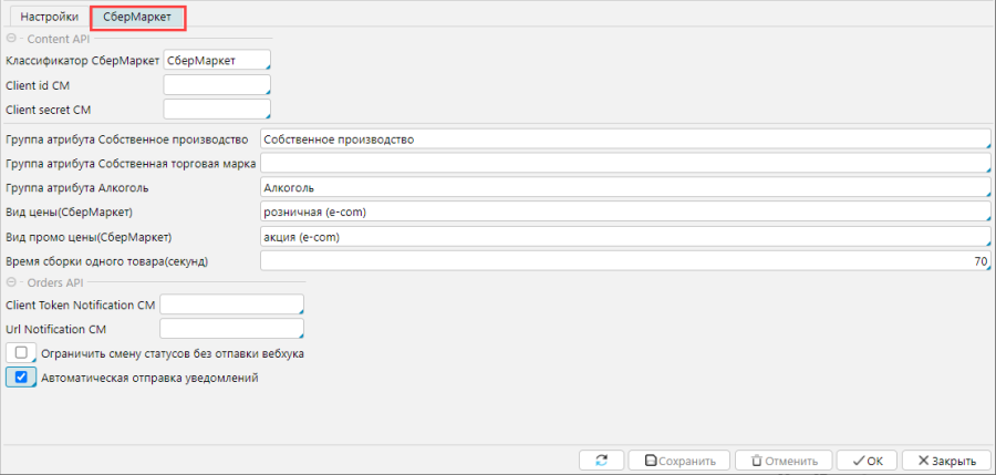 На вкладке СберМаркет настраиваются специфические параметры для работы именно с сервисом «СберМаркет».