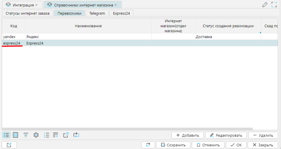 На форме Рабочий стол – Справочники интернет-магазина на вкладке Перевозчики необходимо добавить перевозчика для службы Express24 для которого обязательно указать Код "express24" и удобное для пользователей наименование.