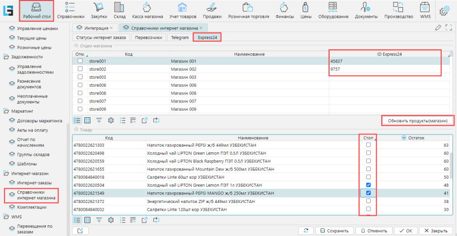 Для выгрузки товаров на форме Рабочий стол – Справочники интернет-магазина на вкладке Express24 для каждого магазина, который формирует заказы для сервиса доставки необходимо указать ID магазина в системе Express24.