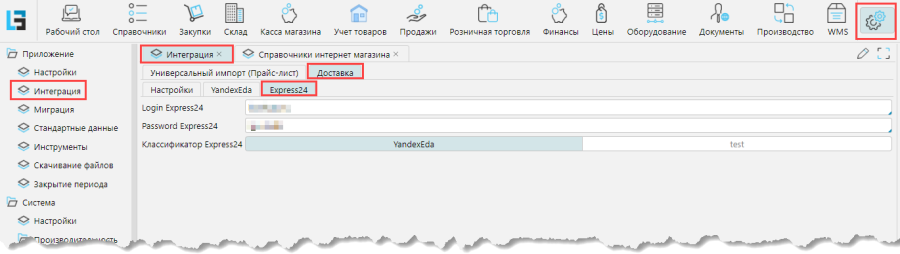 Для работы с сервисом необходимо на форме Администрирование – Интеграция – Доставка на вкладке Exspress24 настроить параметры для обмена данными с сервисом: