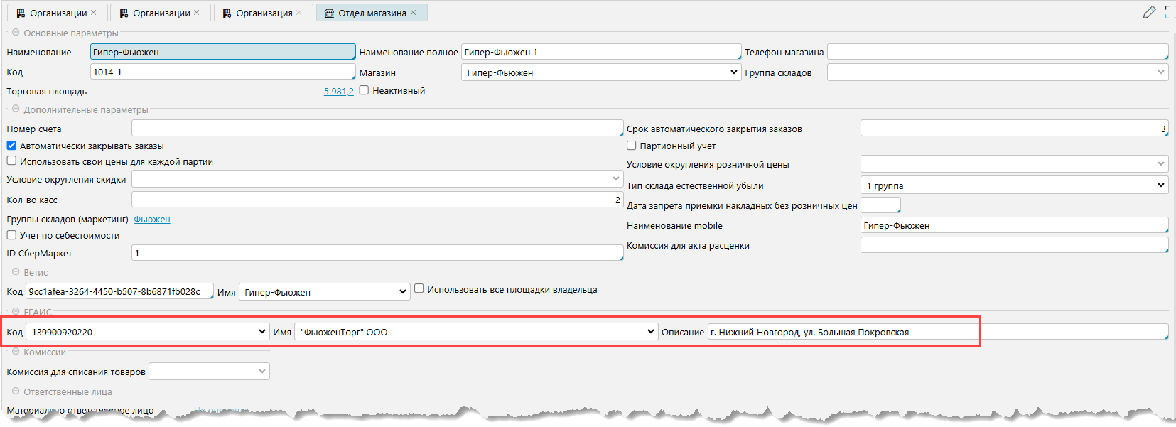 В карточке склада и/или в карточке отдела магазина надо выбрать соответствующую ему организацию ЕГАИС в поле **Код **или Описание блока ЕГАИС.