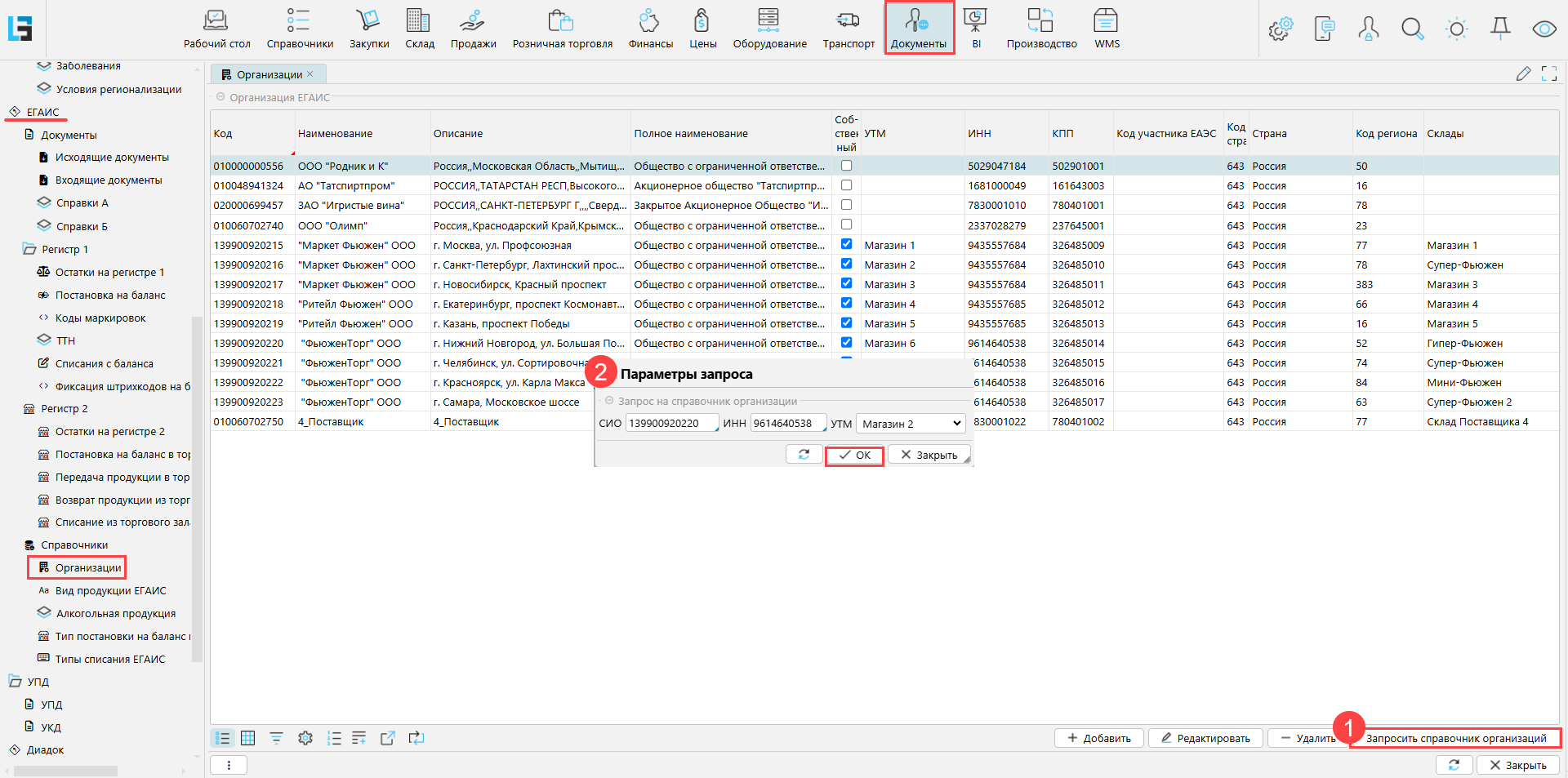 1. Первоначально, организации нужно загрузить из ЕГАИС, для этого нажать Запросить справочник организаций и заполнить параметры запроса: СИО, ИНН организации и УТМ