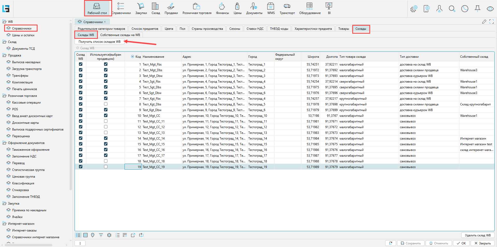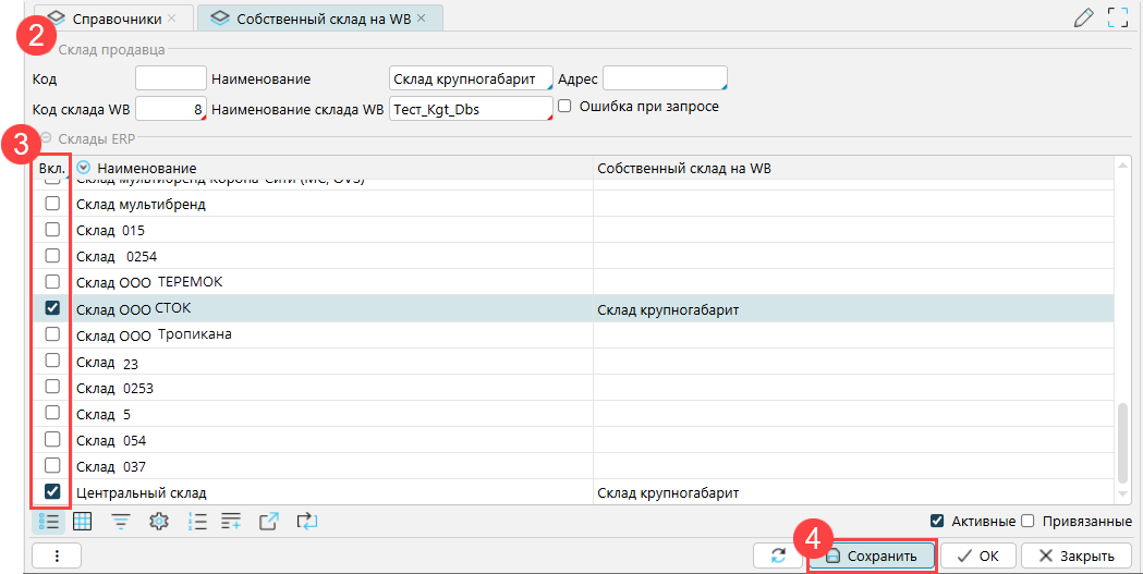 Склады продавца можно создавать в личном кабинете WB или из системы. Склады продавца отображаются на вкладке Собственные склады на WB формы Рабочий стол - WB - Справочники - **Склады **(рис. 2).