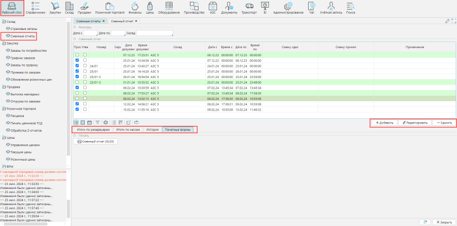 Отчеты представлены на форме Рабочий стол – Сменные отчеты. Для формирования отчета нужно нажать кнопку Добавить и в новом документе указать параметры отчета: