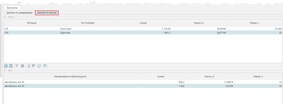 На вкладке Данные по кассам отображается реализация в разрезе кассы и типа платежа. По выделенным строкам в блоке SKU отображается количество реализованного товара.
