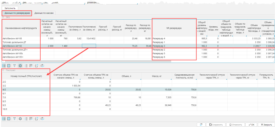На вкладке Данные по резервуарам будут представлены данные по товарам (видам топлива) в разрезе резервуаров: остатки на начало и конец смены, поступления и расходы, фактические количества и объемы при различных физических условиях. По товару, выделенному курсором, в нижней таблице отображаются данные расхода в разрезе пистолетов ТРК.