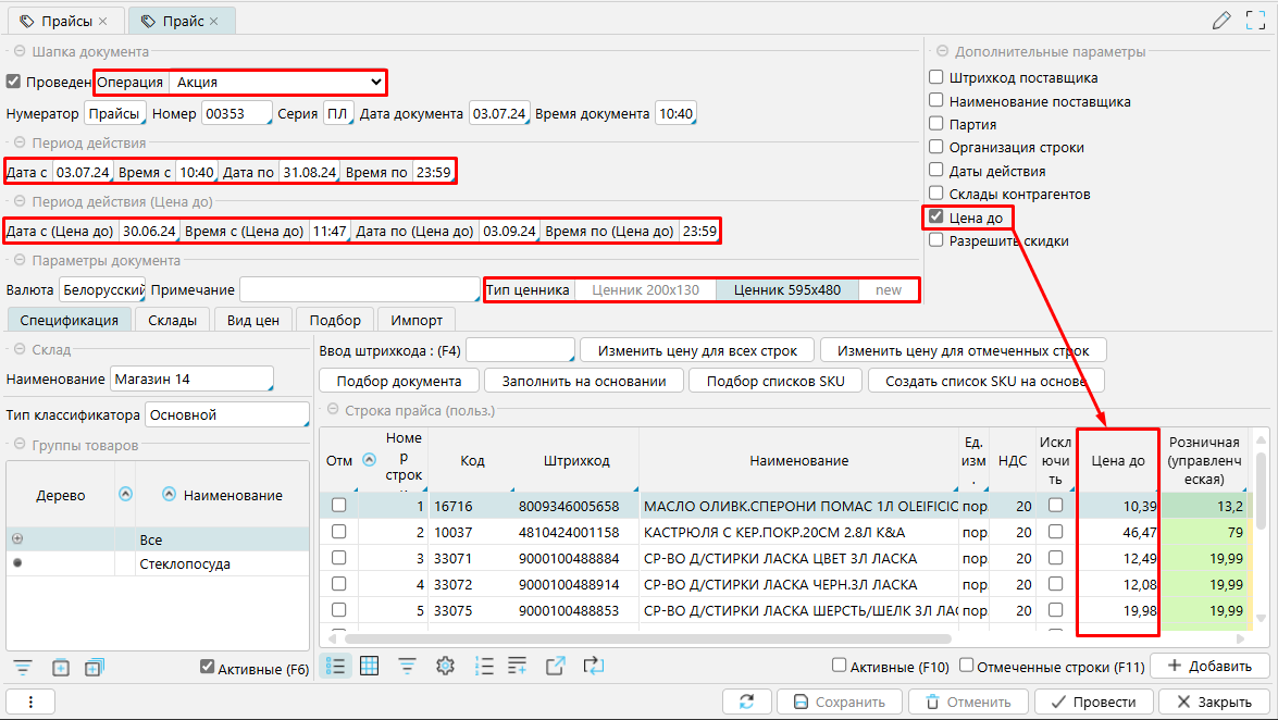 В области "Дополнительные параметры" подтянется настройка "Цена До" из операции "Акция". Такая же колонка появится в строках Прайса.