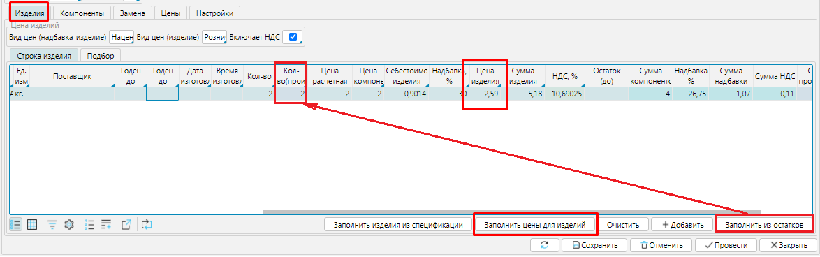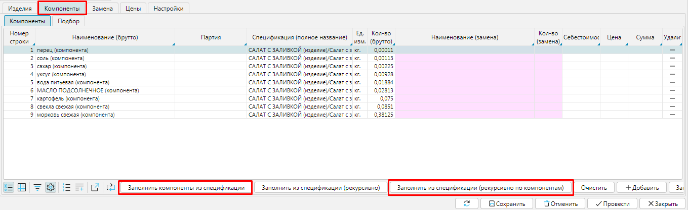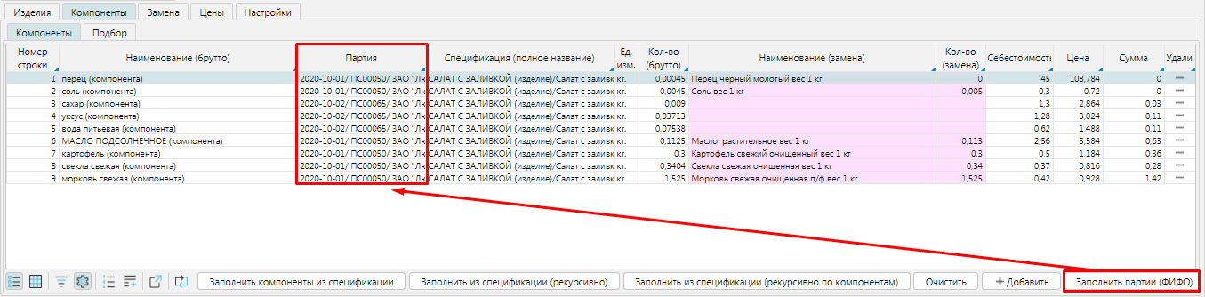 Также на вкладке Компоненты можно использовать кнопку Заполнить партии (ФИФО) и будут применены цены из проставленных партий.