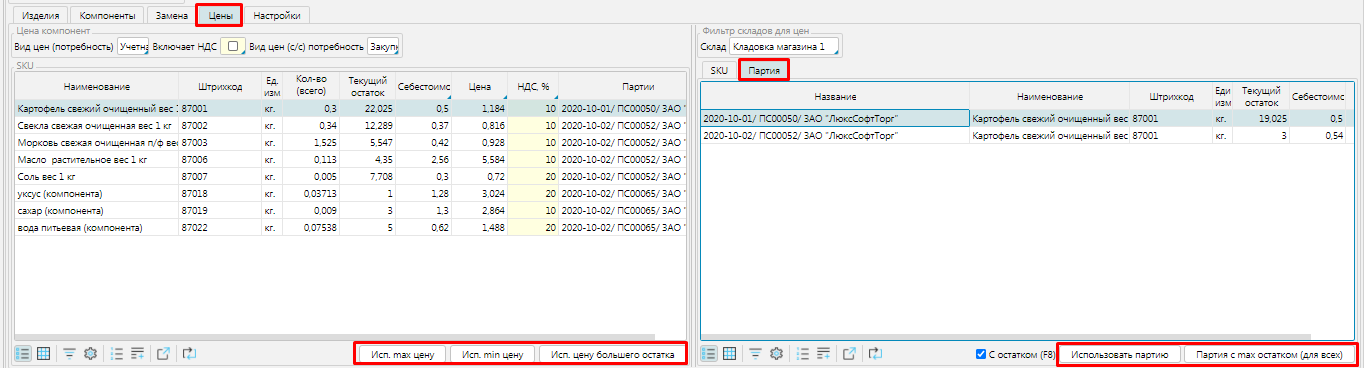 На закладке Партия можно выбрать для каждого компонента конкретную партию  и нажать Использовать партию, или нажать кнопку Партия с мах остатком (для всех) , для всех компонентов будут проставлены такие партии и использованы цены их этих партий.