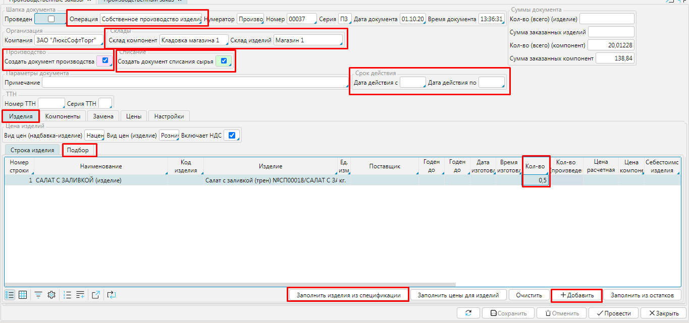 Создать документ производства - если свойство включено, при проведении документа будет создан документ Производство и готовая продукция поступит на указанный склад изделий в количестве, указанном в столбце Кол-во (произведено) на вкладке Изделия.